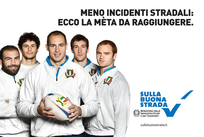 Anche quest’anno la Nazionale italiana di rugby e’ testimonial della campagna istituzionale per la sicurezza stradale, “Sulla buona strada”, del ministero delle Infrastrutture e dei Trasporti, volta a sensibilizzare i cittadini al rispetto del Codice della Strada. Dopo aver prestato i loro volti nella campagna dello scorso anno, gli atleti della Nazionale, in occasione della partita Italia-Irlanda, che si giochera’ il 5 febbraio allo stadio Flaminio di Roma, scenderanno in campo preceduti da uno striscione con il claim della campagna “Quando guido io non scherzo”.