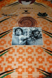 scusami per la qualità della carta ma non ho trovato di meglio. Finalmente riesco a tenere fede alla promessa di partecipare al tuo museo. La maglia in questione è un po’ particolare ed ha un grande valore affettivo per me. E’ infatti la prima maglia indossata in una partita ufficiale dagli atleti dell’Aquila Rugby dopo il sisma del 6 aprile.