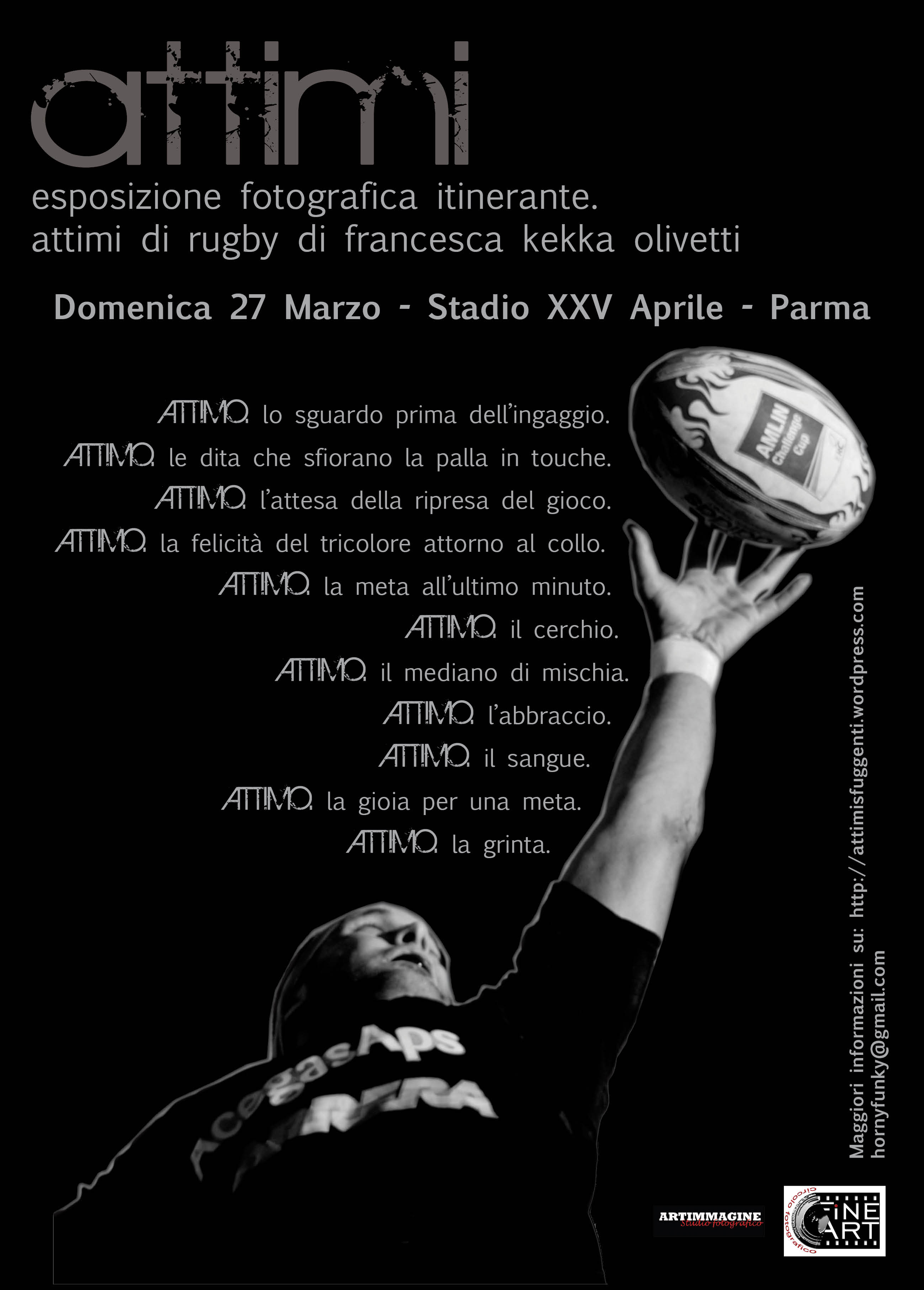 “ATTIMI. È una selezione di 20 scatti che racchiudono l’idea che ho del rugby. Non semplicemente l’azione ma tutto quello che è il rugby nella sua complessità.Ogni partita ha una sua storia che va raccontata e vissuta. Ogni partita è un momento irripetibile diverso dalla partita precedente o successiva. ATTIMO.Uno sguardo prima dell’ingaggio in mischia, una meta, un placcaggio, una ferita sanguinante, la pioggia battente sulla solitudine di un giocatore. Il riscaldamento prima della partita, il cerchio dove ritrovare la concentrazione. La grinta delle ruck. La gioia per una meta, la gioia per un successo incorniciata dal tricolore. La palla sfiorata con due dita in touche, che sembra fermarsi per un ATTIMO suggello del momento di massima concentrazione e sforzo. Questo è rugby. Almeno questo è il rugby visto da me.”