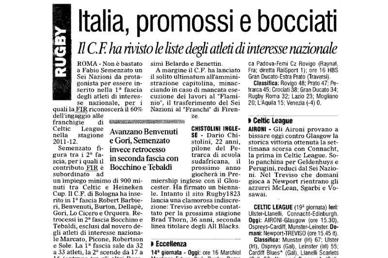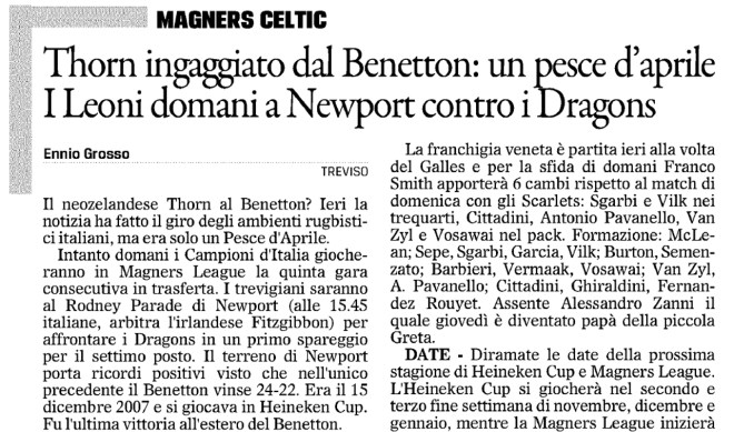 Se molti lettori avevano subito capito che era un gioco, non così sembra essere stato per alcuni addetti ai lavori del mondo ovale italiano. L’arrivo dell’All Black Brad Thorn a Treviso l’anno prossimo – pesce d’aprile che ho architettato in combutta con Duccio Fumero di Rugby 1823 – era una notizia troppo ghiotta per passare inosservata. E se Il Gazzettino, edizione di Treviso, riprende la notizia addirittura nel titolo (ma come pesce e senza citare la fonte…), peggio fa il Corriere dello Sport. Che ci casca in pieno (citando solo Rugby 1823…)! Le “prove” nelle foto qui pubblicate.