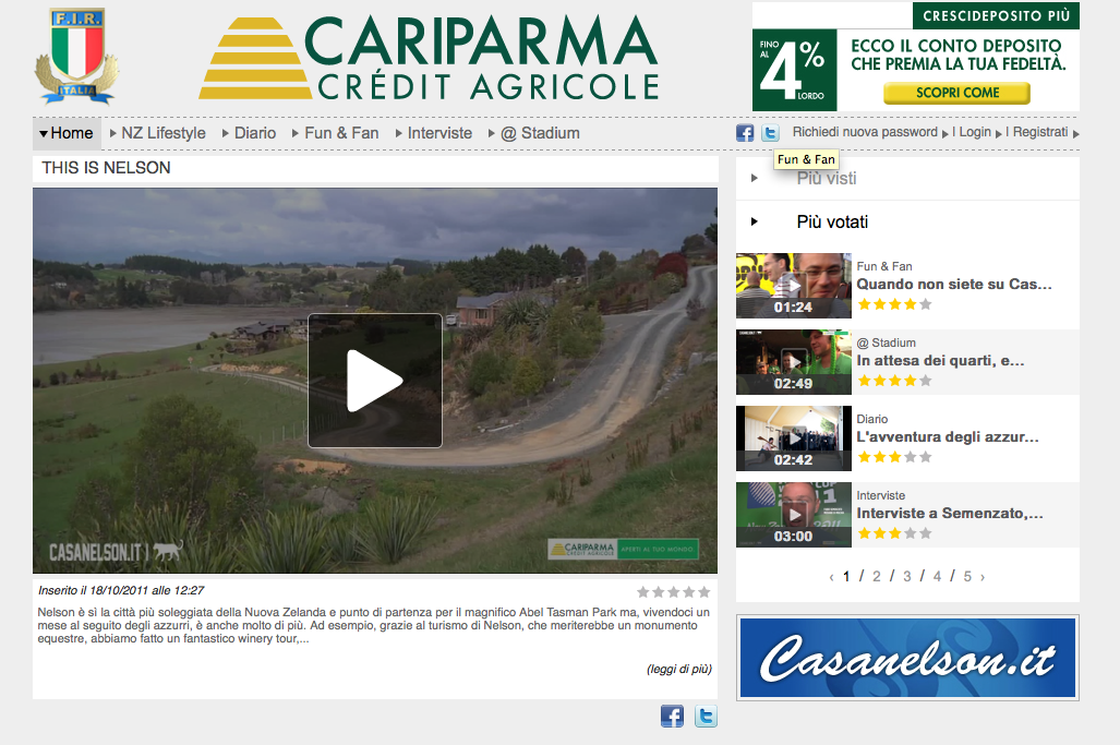 In totale sono 40 i video e 10 le photogallery prodotti dal 1 di settembre al 20 di ottobre, declinate sui 5 canali di Casanelson: Interviste e Diario hanno accompagnato gli azzurri di Mallett alla ricerca del quarto di finale, Nz lifestyle ha regalato scorci di maestosa bellezza attraverso un tour dell’isola sud, mentre Fun&fan e @the Stadium hanno trasmesso le impressioni e le bizzarrie dei tifosi del mondiale.
