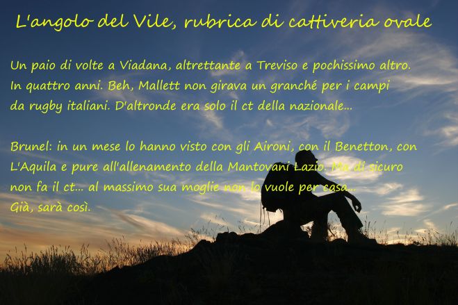 5. gentilissimo vittorio,si forse mallet doveva girare di più ,ma per vedere che?il campionato italiano è inguardabile-anche un pazzo come me dopo 20 minuti lascia lo stadio.però la fir decisamente aiutera brunel il rugby si gioca essenzialmente in padania .Il nostro beneamato presidente (il primo nella storia del nostro rugby ad essersi autoassegnato un congruo stipendio)sta distruggendo non so se scientemente o per caso il rugby nel sud . Pensare che in calabria una squadra nata dal nulla in pochi anni portò 5 atleti nelle squadre nazionali!!!pensa quante squadre