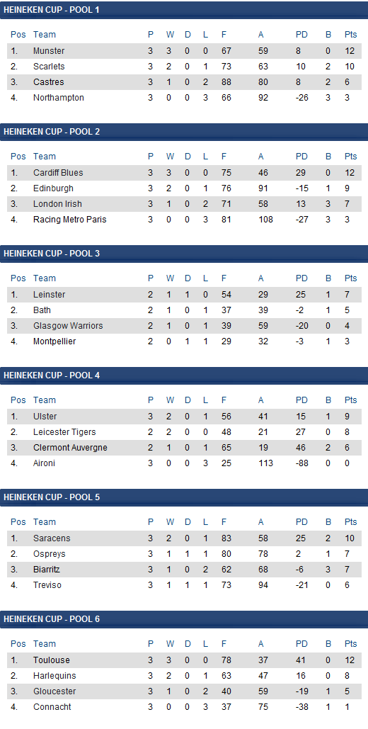 | 13:30 | Heineken Cup Pool 5 | Benetton Treviso | 30 – 26 | Biarritz | ||||