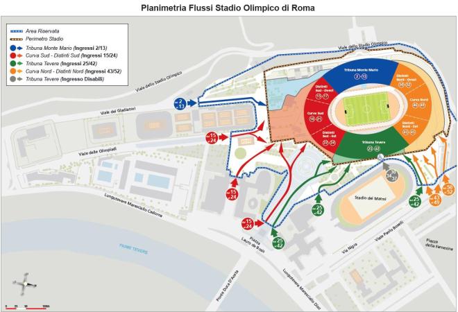 – Accessi per disabili: settore riservato Tribuna Tevere, parcheggio riservato presso Largo Ferraris IV (esterno Curva Nord)