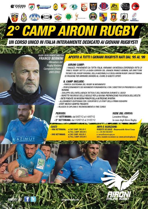 Sono aperte le iscrizioni al SECONDO CAMP AIRONI RUGBY per i ragazzi nati dal 1995 al 1999 diretto da coach Franco Bernini che si terrà al Lavadera Village di Viadana (MN), la casa degli AIRONI . Due i turni dall’ 8 al 14 Luglio oppure dal 15 al 21 Luglio.