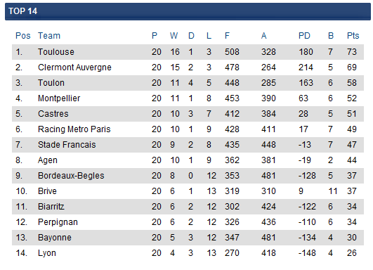 Vince ancora anche Clermont, che passa in casa dell’Agen 29 a 20. Risale in classifica anche il Biarritz, che supera Brive (26-11), mentre Montpellier la spunta sul Bayonne 37 a 26. Lo Stade Francais vince e conquista un punto di bonus con il Lione (40-19).