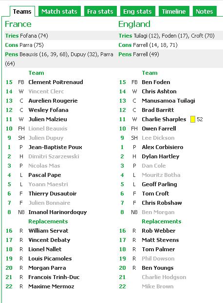 La più bella gara giocata finora dagli inglesi nel torneo (una bella spinta per la conferma del ct “ad interim” Stuart Lancaster), una Francia costretta sempre ad inseguire e che si mete a macinare un po’ di gioco – ma mica troppo – solo dopo 50/55 minuti. Quel poco basta però a riportarsi sotto, fino al 70′ quando una improvvisa penetrazione di Croft regala il vantaggio sufficiente per portarsi a casa una vittoria che rimette la nazionale di Sua Maestà in corsa per la vittoria finale del torneo. Poi il lunghissimo assalto dei galletti : al 74′ Fofana riapre però nuovamente i giochi. Il drop di Trinh-Duc del minuto 79 è troppo corto. Francia fuori dai giochi, Inghilterra che spera ma che dovrà fare il tifo proprio per la Francia che la prossima settimana affronta il Galles.