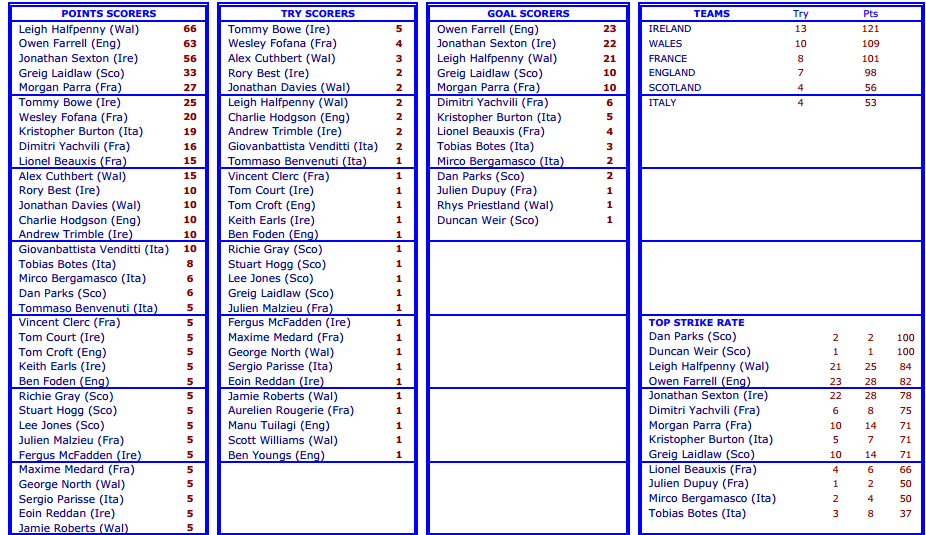 Sei Nazioni 2012, tutti i marcatori del torneo