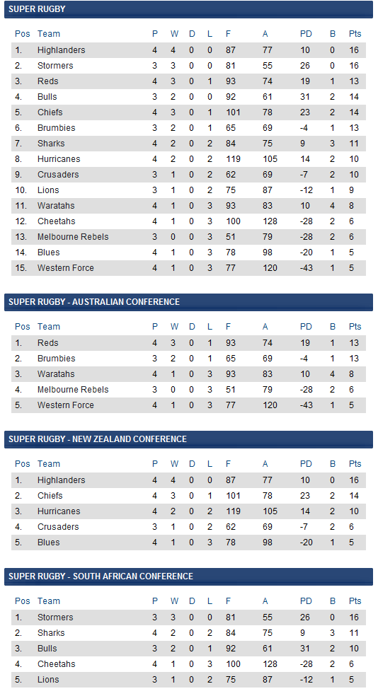 Super Rugby. tutti i risultati del quarto turno e le classifiche