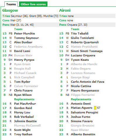 Al Firhill Stadium di Glasgow i Warriors padroni di casa tengono fede al pronostico e continuano nella loro stagione sorprendente superando gli Aironi e restando così in zona play-off, anche se non riescono a centrare il punto di bonus offensivo come auspicato alla vigilia. Per gli Aironi, invece, non arriva il primo punto esterno della stagione e anche Luciano Orquera non riesce ad abbattere il muro dei 100 punti segnati: l’apertura nero-argento si ferma infatti a 99 con i 6 punti segnati trasformando le due punizioni concesse dal direttore di gara. Glasgow ha preso subito il pallino del gioco, costringendo gli Aironi a giocare profondi nella propria metà campo difensiva. In più Del Fava e compagni hanno pagato qualche difficoltà di troppo sia in mischia ordinata che in touche nella prima parte di gara. Glasgow ne ha approfittato per portarsi sul 9-0 grazie al piede del quasi infallibile Duncan Weir, poi ha saputo replicare subito alla rimonta degli Aironi (i due calci di Orquera per il 9-6) andando in meta prima dell’intervallo con un’ottima combinazione che ha aperto la strada a Seymour. In avvio di ripresa ancora il piede di Weir e poi la meta di Grant spinto oltre la linea dalla maul scozzese, hanno chiuso la pratica. I padroni di casa hanno così iniziato a giocare per il bonus, trovando però solo la marcatura di Murchie in superiorità numerica (giallo ad Aguero) che ha fissato il 29-6 finale. Da segnalare negli Aironi l’esordio assoluto per il giovane tallonatore classe ’90 Antonio Denti.