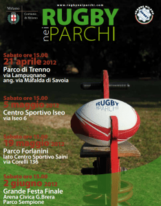 Il Comune di Milano e Rugby Grande Milano organizzano la prima edizione di Rugby nei Parchi. Dal prossimo 21 aprile, oltre quattrocento ragazzi “invaderanno” in modo gioioso quattro parchi di Milano. Si inizierà dal Parco di Trenno (sempre dalle 15), seguiranno poi il Centro Sportivo Iseo (5 maggio) Il Parco Forlanini (19 maggio) e per la Grande Festa Finale l’Arena Civica “Gianni Brera” nel Parco Sempione (2 giugno).