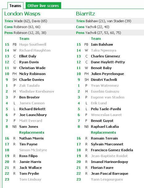 Secondo tempo incredibile a Wycombe: al 60′ Biarritz avanti di 14 punti, poi due mete degli inglesi riapoino la gara. Gli Wasps trovano il pareggio al minuto 66, ma devono capitolare a 5 minuti dalla fine, quando Yachvili mette tra i pali un piazzato e fissa il risultato sul 26 a 23 finale. Francesi in semifinale.