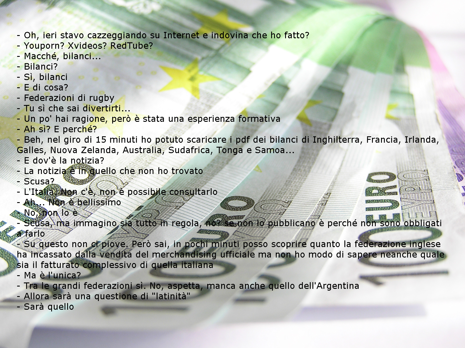 2. Da quelo che so io, invece, chiunque ha chiesto le note esplicative al bilancio (non sono altro che le singole spese di un capitolo di bilancio). , nessuno ha mai potuto averle. Ad esmpio: Il Presidente Dondi da più di 12 anni prende uno stipendio dalla FEderugby di 120.000,00 euro all’anno. La delibera dello stipendio del Presidente prevede anche un indicizzazione del 5% annuo per la svalutazione del denaro. Dopo 12 anni non si sa a quanto è arrivato questo stipendio. Provate a chiedere, facendo richiesta formale per iscritto al Segretario Federale e/o al Direttore Amministrativo (e può farlo ogni tesserato), di sapere a quanto è arrivato lo stpendio di Dondi dopo 12 anni che è Presidente della FIR. Ho fatto quest’esempio ma avrei potuti farne centinaia. Purtroppo dalla Federugby non esce niente e se chiedi ti dicono che devi andare a Roma a visionarle i bilanci in fir e se chiedi le singole spese devi ritornare almeno un’altra volta a Roma.