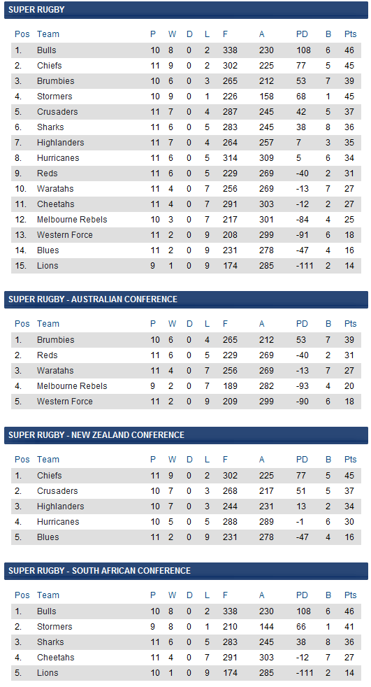 Super Rugby: il quadro alla giornata numero 12 Date Match May 13, 2012 Reds 42 – 27 Chiefs May 12, 2012 Highlanders 20 – 26 Hurricanes Melbourne Rebels 28 – 19 Crusaders Sharks 53 – 11 Force Stormers 16 – 14 Cheetahs May 11, 2012 Blues 25 – 3 Lions Waratahs 24 – 27 Bulls Condividi:Tweet Fai clic per condividere su WhatsApp (Si apre in una nuova finestra) WhatsApp Fai clic per inviare un link a un amico via e-mail (Si apre in una nuova finestra) E-mail Fai clic per condividere su Telegram (Si apre in una nuova finestra) Telegram Condividi su Tumblr Fai clic qui per condividere su Reddit (Si apre in una nuova finestra) Reddit Fai clic qui per stampare (Si apre in una nuova finestra) Stampa Mi piace Caricamento... Correlati