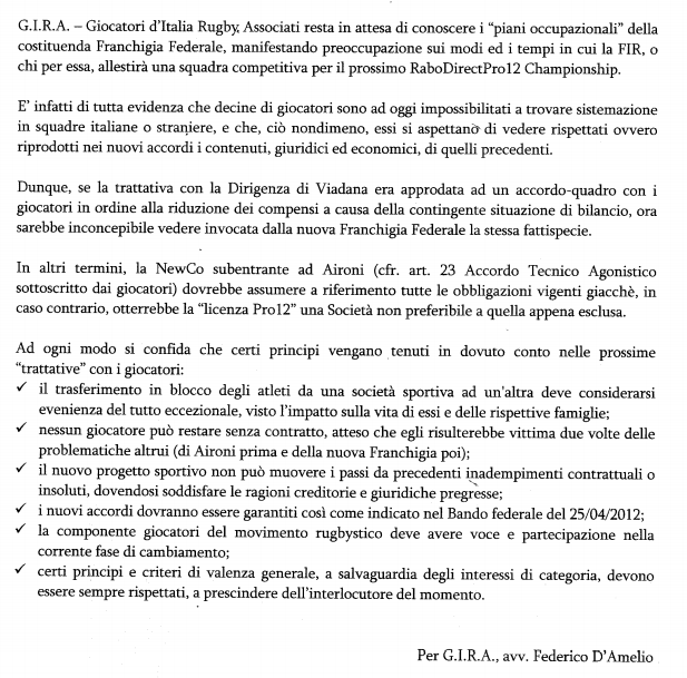 1. E io penso male ancora di più…..non ci arrivano proprio è questo il dramma. Con una lettera del genere in un qualsiasi rapporto tra cliente (giocatori) e fornitore (fir o Aironi) il fornitore prende paura chiama il cliente e cerca di risolvere il problema. In questo caso una utopia.