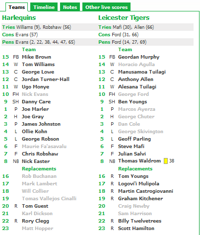 Leicester però inizia la seconda frazione con un vero black-out (e con un uomo in meno per il giallo a Waldrom) e i Quins arrivano sul 30 a 13. Quando tutto sembra ormai finito i Tigers ritrovano orgoglio e concentrazione e si riportano sotto, ma è troppo tardi e l’ultimo infinito attacco si infrange in una penalità commessa a due metri dalla linea di meta. Harlequins campioni, devo dire meritatamente dopo aver dominato la stagione regolare.