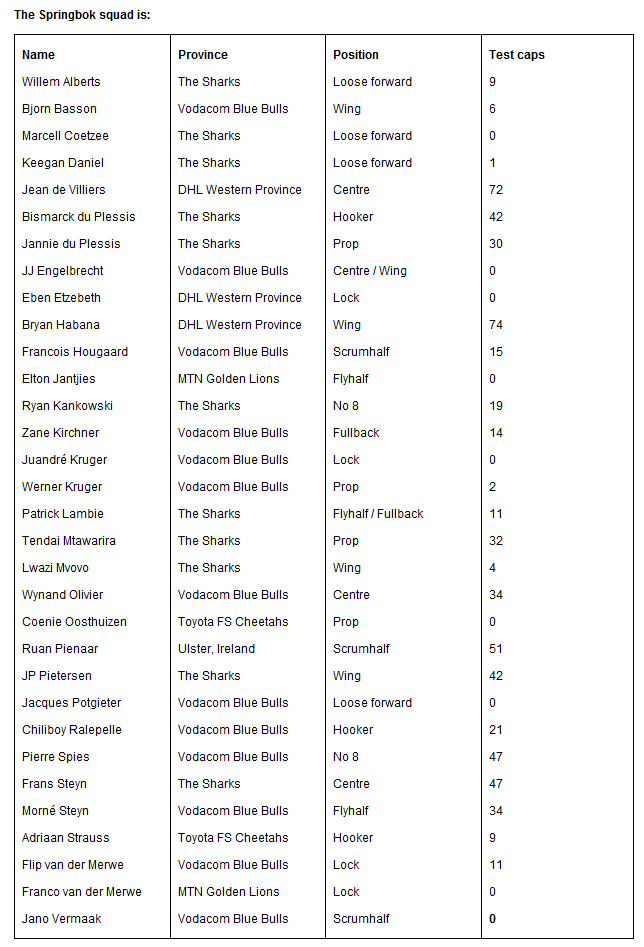 Nove giocatori al debutto in nazionale. Inizia da qui l’avventura di Heyneke Meyer alla guida della nazionale sudafricana. Quasi un terzo dei 32 atleti chiamati per la prima sfida all’Inghilterra in programma sabato a Durban sono quindi una totale novità, si tratta di Marcell Coetzee, JJ Engelbrecht, Eben Etzebeth, Elton Jantjies, Juandré Kruger, Coenie Oosthuizen, Jacques Potgieter, Franco van der Merwe e Jano Vermaak. Quindici invece i giocatori che erano già presenti al Mondiale neozelandese.