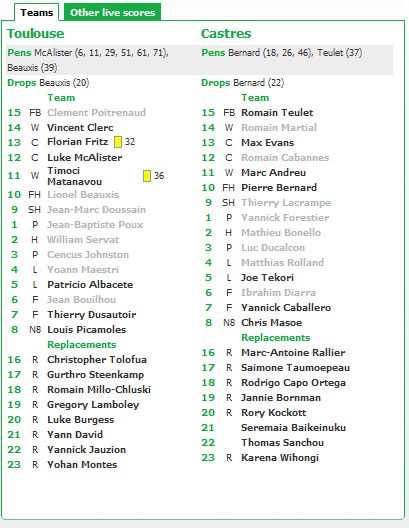 Partita equilibrata per circa un’ora, poi prima Tolosa riesce a disinnescare l’organizzazione del Castres e poi a scavare il break decisivo. Rossoneri con un tasso tecnico decisamente più elevato ma biancocelesti che sopperiscono con la grinta. L’ultimo quarto d’ora però, quando la tenuta atletica comincia a non reggere più il Castres, vede il Tolosa controllare la partita senza rischiare nulla o quasi.