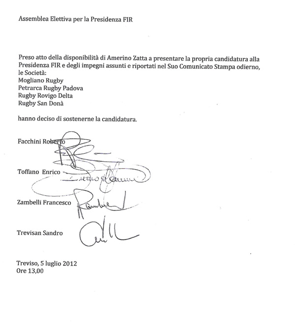 Non succedeva da tanto, tantissimo tempo. Poche ore fa l’annuncio della candidatura di Amerino Zatta a presidente FIR, ora quello in cui tutte le società venete di vertice (ma non solo quelle…) si schierano a favore di quel candidato.