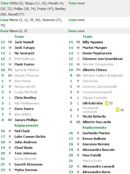 Tries: Penalty, Powell, Higgins, Leota 3, Burrell, Willis, Vernon Cons: Miller 7