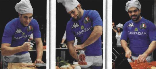 l’erba sulla quale corrono per 80 minuti. Dimenticate i placcaggi. Per un giorno, quattro rugbisti hanno messo da parte le scarpe con i tacchetti e sono entrati in una cucina: quattro colonne della Nazionale italiana guidata dal nuovo coach Jacques Brunel hanno “cucinato” le squadre (Francia, Inghilterra, Irlanda, Galles, Scozia)