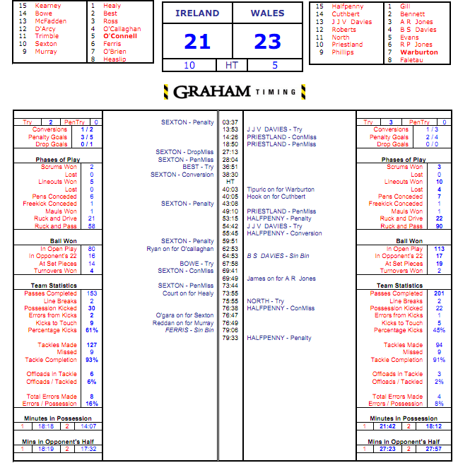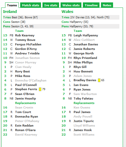 15. Leigh Halfpenny, 14. Alex Cuthbert, 13. Jonathan Davies, 12. Jamie Roberts, 11. George North, 10. Rhys Priestland, 9. Mike Phillips, 1. Rhys Gill, 2. Huw Bennett, 3. Adam Jones, 4. Bradley Davies, 5. Ian Evans, 6. Ryan Jones, 7. Sam Warburton (captain), 8. Toby Faletau