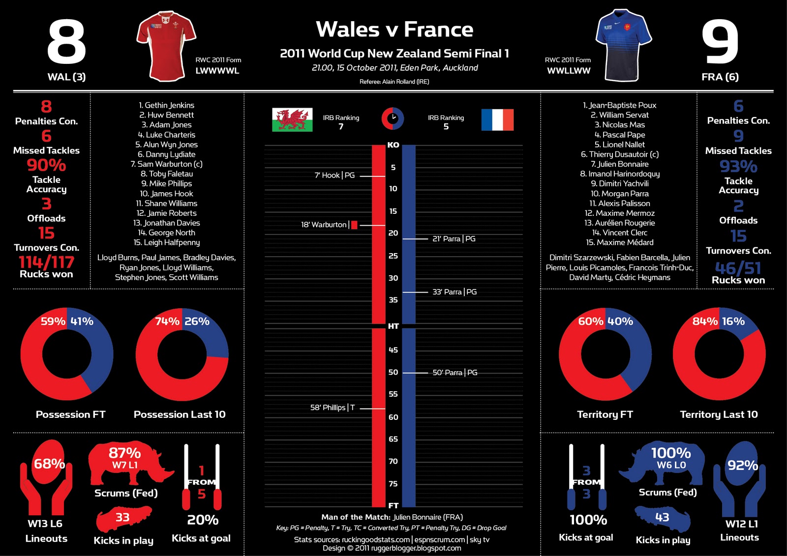 Halfpenny ; North. Jo. Davies, Ja. Roberts, Sh. Williams ; (o) Hook, (m) Mi. Phillips ; Faletau, Ry. Jones, Lydiate ; Charteris, Br. Davies ; Pa. James, Bennett, Ge. Jenkin