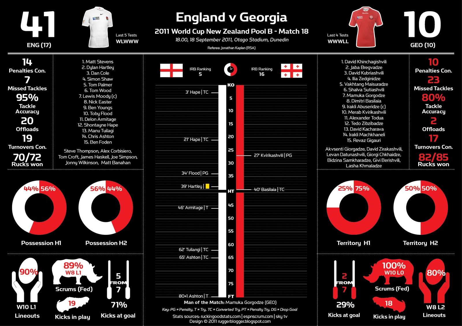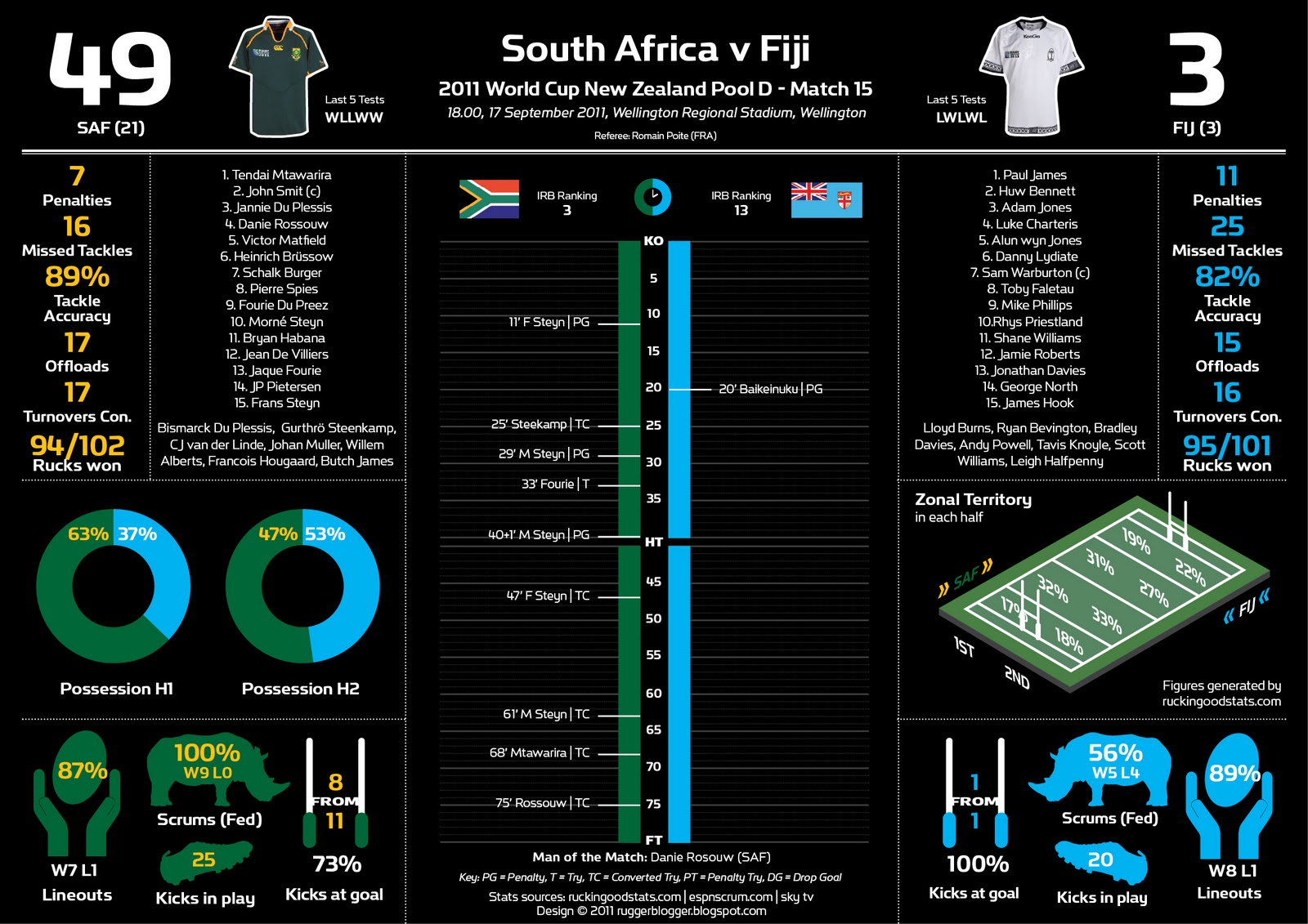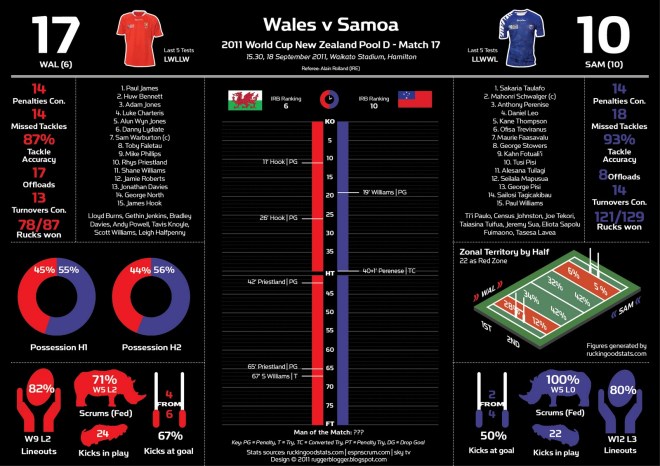 Samoa: 15 Paul Williams, 14 Sailosi Tagicakibau, 13 George Pisi, 12 Seilala Mapusua, 11 Alesana Tuilagi, 10 Tusi Pisi, 9 Kahn Fotuali’I, 8 George Stowers, 7 Maurie Fa’asavalu, 6 Ofisa Treviranus, 5 Daniel Leo, 4 Kane Thompson, 3 Anthony Perenise, 2 Mahonri Schwalger (c), 1 Sakaria Taulafo.