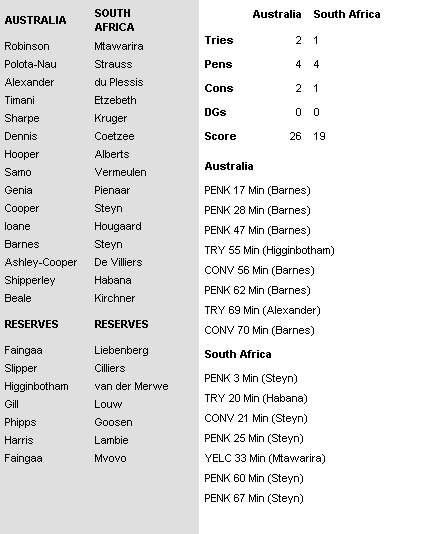 Australia: 15 Israel Folau, 14 Henry Speight, 13 Tevita Kuridrani, 12 Kurtley Beale, 11 Reece Hodge, 10 Bernard Foley, 9 Will Genia, 8 Sean McMahon, 7 Michael Hooper (c), 6 Ned Hanigan, 5 Adam Coleman, 4 Rory Arnold, 3 Sekope Kepu, 2 Tatafu Polota-Nau, 1 Scott Sio