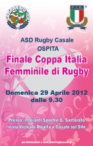 Si comincerà a giocare alle 9.30 di domenica prossima, 29 aprile, sui campi messi a disposizione dal Rugby Casale (Impianti “G. Sartorato”, Via Vicinale Rivalta, Casale sul Sile, TV) per lo svolgimento dei maxi concentramenti di Coppa Italia di Rugby a Sette che a fine giornata decreteranno le due squadre vincitrici della Coppa Italia Femminile Seniores a 7 2011/2012 e del Trofeo Interregionale Under 16 2011/2012.