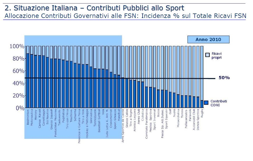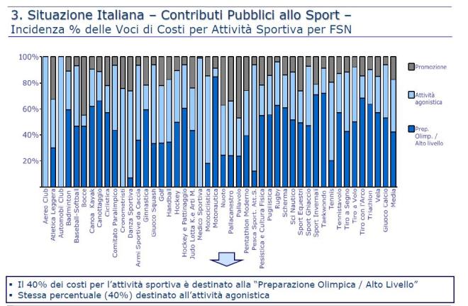 Io ho estrapolato le poche slide in cui si parla esplicitamente anche di rugby. Cosa si evince? Che la FIR spende oltre il 60% dei suoi introiti per la preparazione all’Alto Livello e una quota bassissima per la promozione. E che è tra le federazioni ad avere il minor numero di contributi CONI.