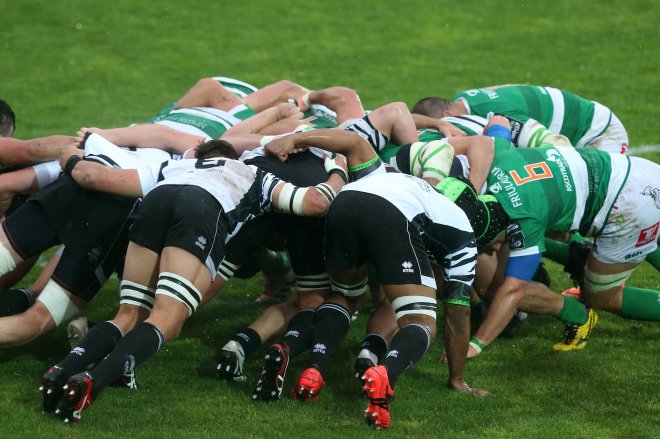 La pioggia non aiuta l’afflusso di pubblico e al Battaglini arrivano in 2.500 circa. Non aiuta nemmeno le due squadre in campo, con diversi errori di handling da parte di tanti giocatori ma il Petrarca sembra meno inquadrato rispetto ai padroni di casa che iniziano la gara con la giusta determinazione e cattiveria. Bianconeri che commettono diversi errori anche nelle prese alte e tra il 9′ e il 14′ i rossoblu piazzano due mete che li lanciano sul 14 a 3 prima del quarto d’ora.
