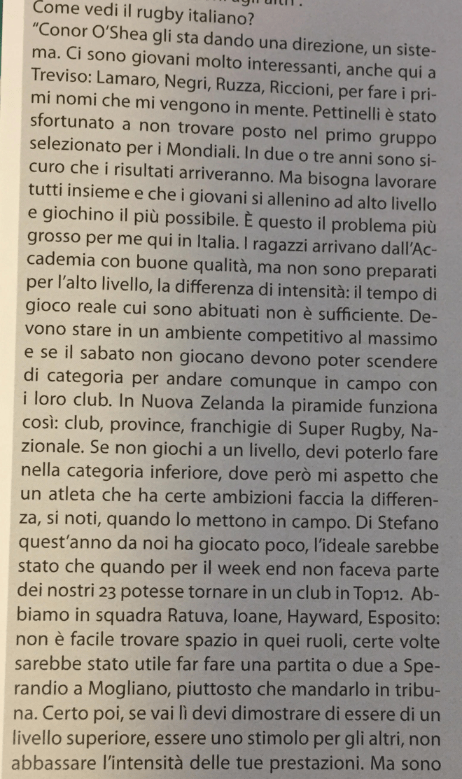 Lo so, qualcuno mi piglierà per fissato, ma sta cosa dei permit player mi fa uscire pazzo. AllRugby in edicola questo mese (il numero 137), il direttore del mensile – Gianluca Barca – intervista l’head coach del Benetton Treviso, Kieran Crowley, che fa alcune dichiarazioni che riporto nelle foto pubblicate sotto. Robe del tipo che i ragazzi dell’Accademia non sono pronti per l’alto livello nonostante le buone qualità, che devono allenarsi con le celtiche, che hanno bisogno di minutaggio e che se non possano scendere in campo con quest’ultime devono poter andare a giocare nelle squadre del Top 12, eccetera eccetera. Parole di buon senso. Totale buon senso.
